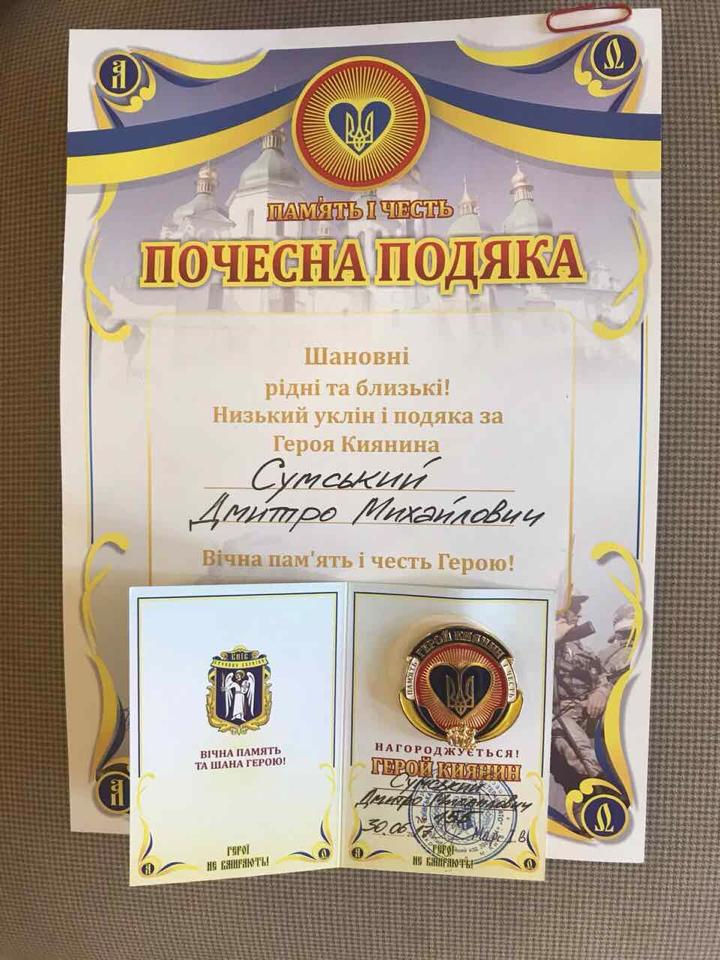 ГЕРОЙ КИЯНИН 30 травня нагородили сім'ї загиблих Героїв нагородами "Герой Киянин". На заході були присутні матері та дружини загиблих Героїв. Голова організації Тріскач С.М, та громадський діяч Гліб Гржибовський сказали вступне слово, після чого всі присутні вшанували пам'ять загиблих хвилиною мовчання. Після нагородження був невеликий концерт, де прозвучали пісні про матерів та Героїв.